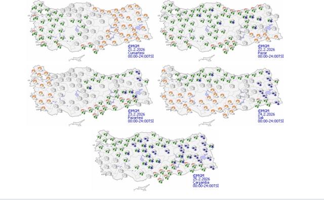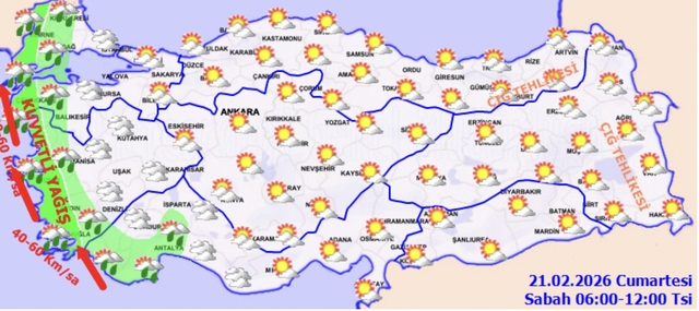 Meteoroloji Genel Müdürlüğü tarafından hava durumu raporu paylaşıldı. Hafta sonu plan yapacak olan vatandaşlar güncel hava durumunu araştırıyor. Meteoroloji Genel Müdürlüğü (MGM) olarak yapılan değerlendirmelere göre ülkemizin batı kesimlerinin parçalı ve çok bulutlu, Marmara'nın güney ve batısı, Ege ve Batı Akdeniz'in sağanak yağışlı, diğer yerlerin az bulutlu geçeceği tahmin ediliyor. İşte, 21-22 Şubat hava durumu raporu