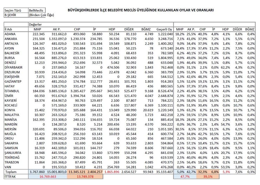 Büyükşehir İlçe Belediye Meclislerinde ise MHP%5,0 olurken, AK Parti %42,7 çıkmış; toplamda %47,7 olmuş.