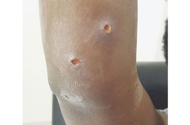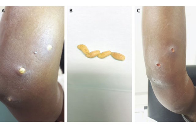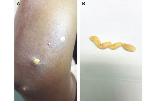 Sıkılan yaraların ardından cilde saplanmış kurtların, Afrika'nın tropik bölgelerine özgü olan insan eti yiyen tumbu sineğinin larvaları olduğu anlaşıldı.