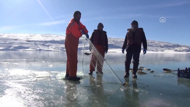 Muş'un Varto ilçesinde balıkçılar, donan Hamurpet Gölü'nde motorlu testereyle kırdıkları buzun altında balık avlıyor
