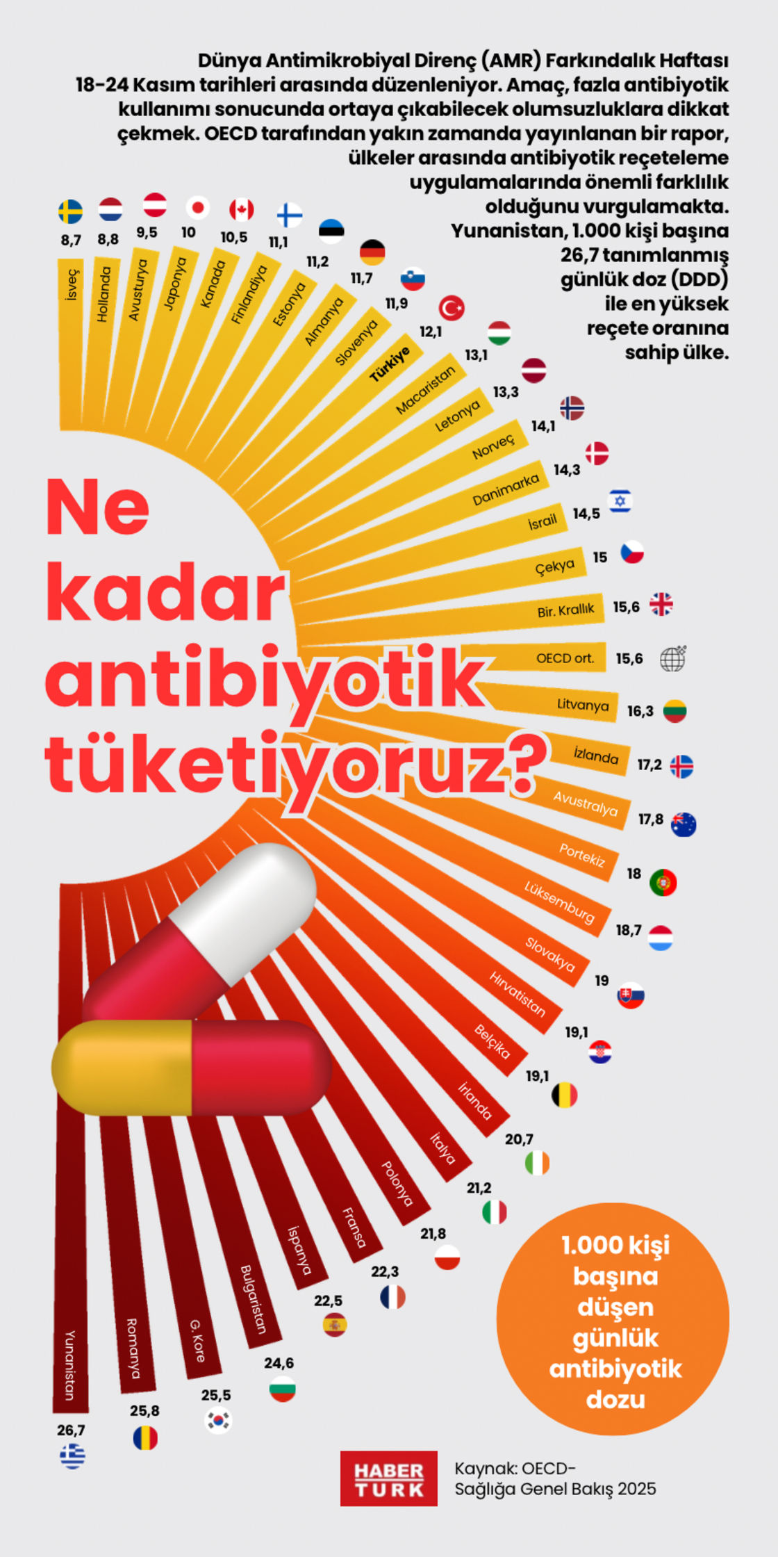 Dünya Antimikrobiyal Direnç (AMR) Farkındalık Haftası 18-24 Kasım tarihleri arasında düzenleniyor. Amaç, fazla antibiyotik kullanımı sonucunda ortaya çıkabilecek olumsuzluklara dikkat çekmek. OECD tarafından yakın zamanda yayınlanan bir rapor, ülkeler arasında antibiyotik reçeteleme uygulamalarında önemli farklılık olduğunu vurgulamakta. Yunanistan, 1.000 kişi başına 26,7 tanımlanmış günlük doz (DDD) ile en yüksek reçete oranına sahip ülke.