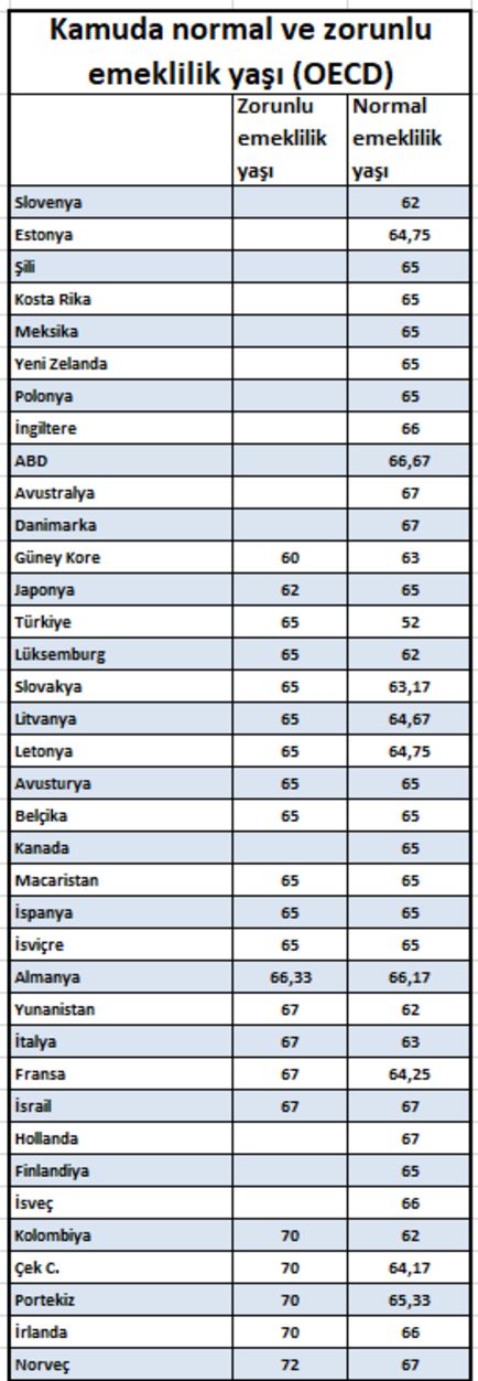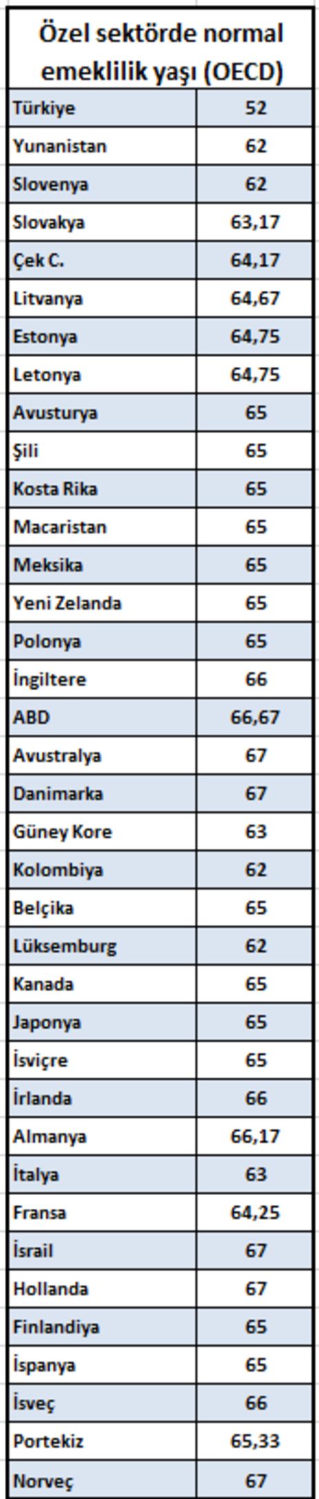 İktisadi İşbirliği ve Kalkınma Örgütü’nün (OECD) 2025 yılı emeklilik raporuna göre, üye ülkelerde ortalama normal emeklilik yaşı 2024 yılında erkekler için 64,7 yıl, kadınlar için 63,9 yıl oldu. Raporda Türkiye’de ortalama emeklilik yaşı kamu ve özel sektörde 52 olarak gösterildi. Özel sektörde Türkiye’den sonra en düşük normal emeklilik yaşı Yunanistan, Lüksemburg ve Slovenya’da 62, Güney Kore, İtalya’da 63 olarak uygulanıyor. En yüksek emeklilik yaşı ise Avustralya, Danimarka, İsrail, Hollanda ve Norveç’te 67.