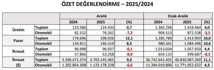 2025 yılında toplam pazar, bir önceki yıla göre yüzde 10 artarak 1 milyon 413 bin 903 adet düzeyinde gerçekleşti. Bu dönemde, otomobil pazarı da yüzde 11 oranında artış sağladı ve 1 milyon 84 bin 496 adet oldu.
