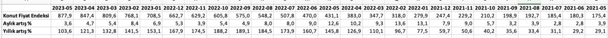 ➔21 ay oldu ki konut fiyatları her ay yüzde 3.6 ve onun üzerinde artıyor. Bitişikteki tablodan görülebileceği gibi 4 ayın artışı da çit haneli oranları geçmiş ve en yükseği yüzde 13.6 ile Şubat 2022’ye ait.