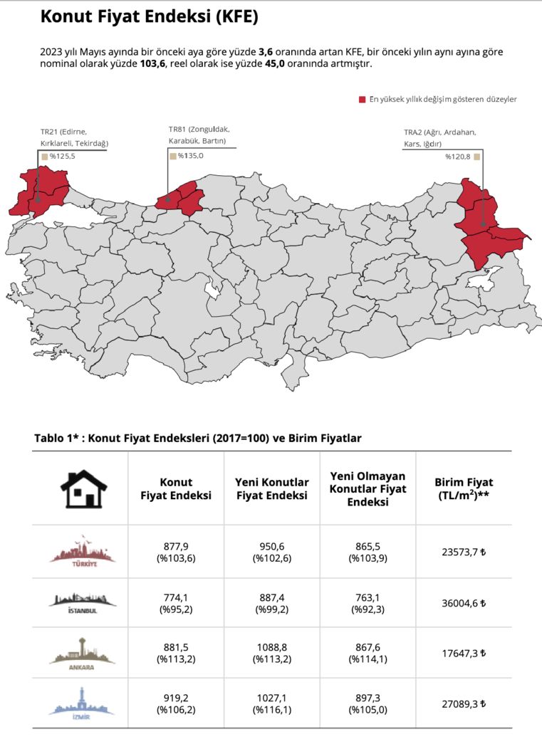 ➔Geçen yılın haziran ayında konut fiyat artışları yüzde 160.7’e ulaşmıştı. Ekimde yüzde 189.1 ile rekor kırdı ve yıllıkta baz etkisinden dolayı yönünü aşağı çevirdi. Mayıs 2023’te ise konut fiyatları yıllık yüzde 103.6 arttı. Ancak aylıkta artışlar devam ediyor.