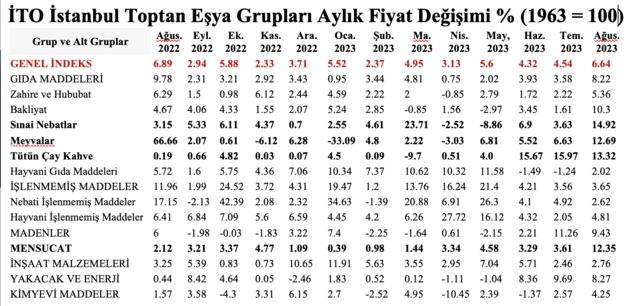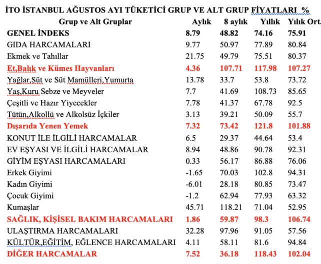 ➔İTO verilerine göre ağustosta en yüksek fiyat artışları yüzde 46 ile kumaşlarda, yüzde 32 ile ulaştırmada yaşandı. Gıda grubu fiyat artışı da yüzde 9.77 ile genel enflasyonun 1 puan üzerinde gerçekleşti.