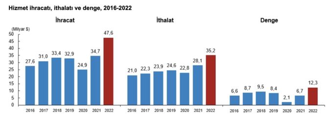 ➔Geçen yıl hizmet ihracatı 47.6 milyar dolara yükselirken hizmet ithalatı 35.2 milyar dolarda kaldı ve 12.3 milyar dolar fazla oluştu.