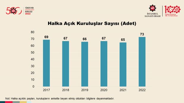 ➔"Son yıllarda bu yönde şirketlerin oldukça istekli olduklarını görüyoruz. Bu eğilim, İSO 500 verilerine de yansıdı. İSO 500 içinde halka açık kuruluşların sayısı 2017-2021 döneminde 65-69 bandında seyrettikten sonra 2022'de 8 adet artarak 73'e yükseldi. Böylece İSO 500 içinde halka açık kuruluşlar sayısı bugüne kadarki en yüksek düzeyine ulaştı.
