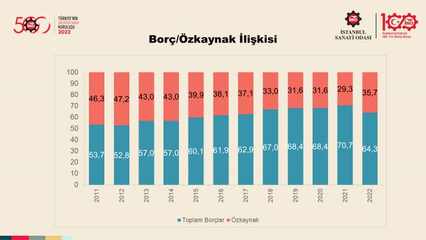 ➔Yüzde 71 borç, yüzde 29 özkaynakla çalışan 500 büyük şirket 2022 yılında yüzde 65 borç ve yüzde 35 özkaynak oranına döndü. Bu durum oldukça pozitif bir gelişme ve şirketlerin yükselmekte olan faizlere karşı bağımlılıklarını azaltan bir gelişme.