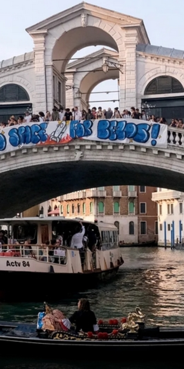 Venedik düğününe davetli ünlüleri, politikacıları ve teknoloji patronlarını taşıyan yüzü aşkın jet indi Marco Polo Havalimanı’na. İklim ve yaşam aktivistleri için daha mümbit bir ortam olamazdı! Her yıl iki santim batan, had safhada iklim kırılganlığı bakımından UNESCO’nun miras listesinde bulunan Venedik, had safhada karbon ayak izi bırakan özel jetlerle gelinecek son yerlerden biriydi. Bezos şehirdeki aktivizmin mücadele ettiği her şeyi temsil ediyordu.