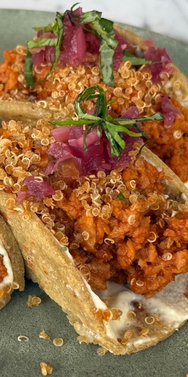 Bitki bazlı beslenmede laboratuvardan çıkan ya da hamur veya soya kullanılarak yapılan alternatif etlere sıcak bakmıyorum. Bazen tempeh’den yapılmış ‘tavuk dilimleri’ ya da ‘soyrizo’ (bir tür vegan sucuk) hoşuma gidiyor ama aslını tercih ederim. Ancak alıcısı var, Bi Nevi Deli de bol bol bu seçenekleri sunuyor: İçinde tempeh olan Vietnam usulü pirinç yufkasına sarılı minik dürümler de, nasıl diyeyim, sağlıklıydı. Bezelye proteini—circa 2018 çok modaydı—taco’ları tercih ederim. Kişniş biraz daha fazla olabilirdi belki, soğan turşusu gerekli bir mayhoşluk katıyordu. Farklı bir mercimek köftesini andırıyordu, çok zorlama bir benzetme yaparsam.