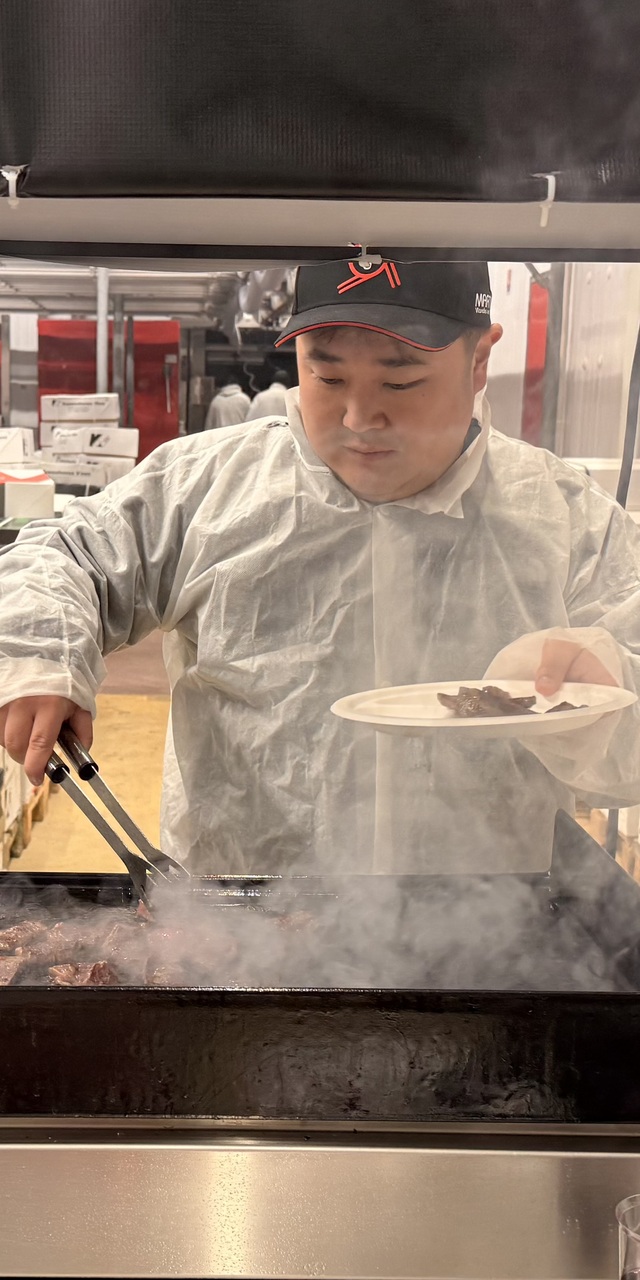 Bizim ekip erkenden ızgaranın başında yer aldığı için ilk çıkan etlerin tadına bakıyor. Neyse ki herkese yetecek kadar çok var. Birazdan uzun bir kuyruk oluşacak, işini bitiren hal çalışanları canlı akordeon eşliğinde bu festivale katılacak.