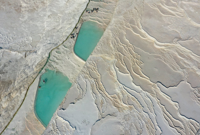 UNESCO Dünya Mirası Listesi'nde yer alan Pamukkale'ye gelen yerli ve yabancı misafirler, pamuksu travertenlerde yürüyüp antik havuzda yüzüyor