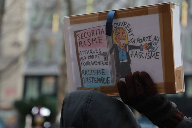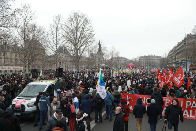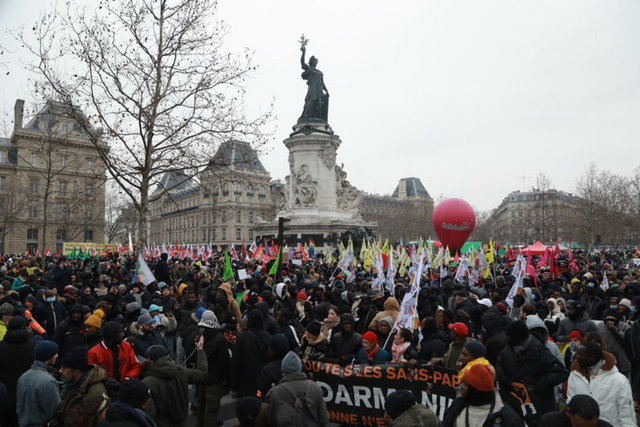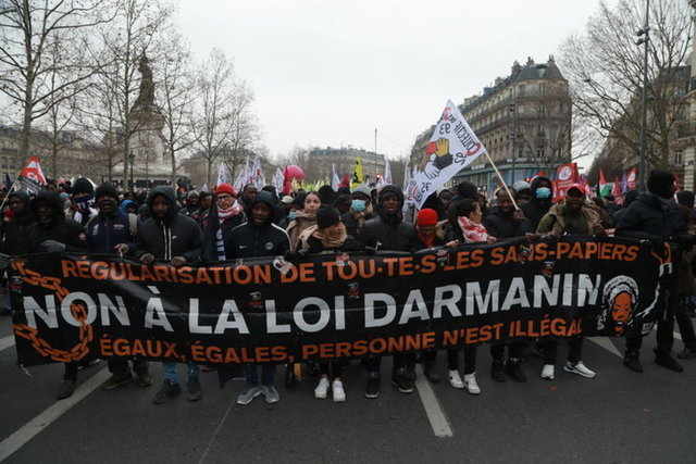 Cumhuriyet Meydanı'nda toplanan göstericiler, Clichy Meydanı'na doğru yürüdü. Protestocular, hükümetin göç yasasını aşırı sağcı Ulusal Birlik (RN) Partisinin oylarıyla parlamentodan geçirmesine tepki gösterdi.