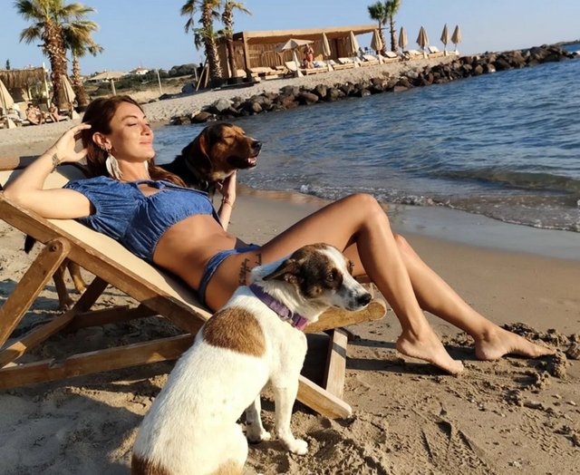 Daha sonra köpeğiyle şezlongda uzanırken çekilen bu karesini de paylaşan Oflaz, gönderisine "Güneşte keyfimiz yerinde." ifadelerini not düştü.