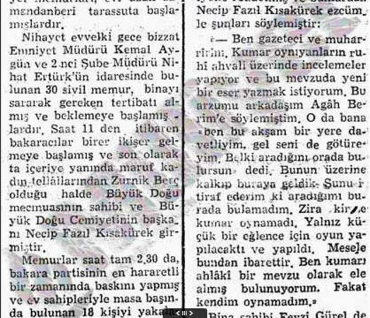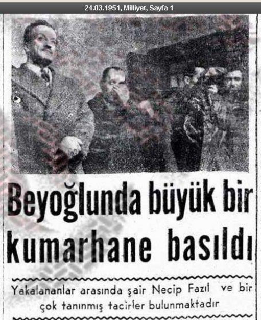 Tartışma bu şekilde uzayıp giderken, Necip Fazıl'ın adı bugün de twitter'da trend topic listesine girdi. Yoğun tartışmaların yaşandığı konuyla ilgili en çok paylaşılan fotoğraf ise, Milliyet Gazetesi'nin bir küpürüydü. 24 Mart 1951 tarihli küpürde, Beyoğlu'nda düzenlenen kumarhane baskınıyla ilgili bir bir haber var. Necip Fazıl Kısakürek'in de yer aldığı fotoğraf karesinin altında "Beyoğlu'nda büyük bir kumarhane basıldı. Yakalananlar arasında şair Necip Fazıl ve birçok tanınmış tacirler bulunmaktadır" yazıyor.