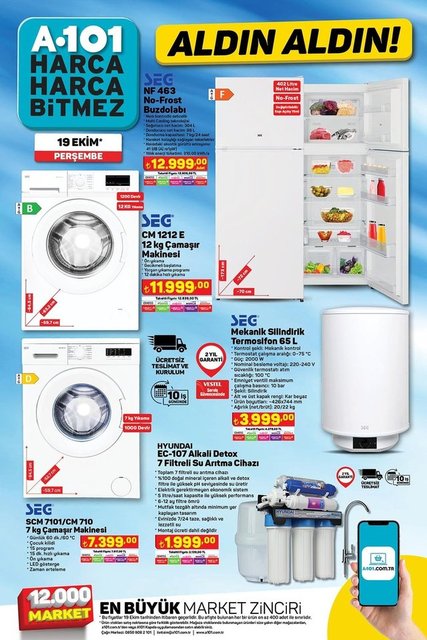 A101'de bu perşembe beyaz eşya ve teknoloji fırsatları dikkat çekiyor. Güncel A101 aktüel kataloğunda; teknolojik aletler, mutfak araç gereçleri ve kozmetik ürünlerin yanı sıra küçük ev aletleri, beyaz eşyalar, giysi çeşitleri, temel gıda ve ihtiyaç ürünleri yer alıyor. İşte 19 Ekim A101 aktüel ürünler listesi...