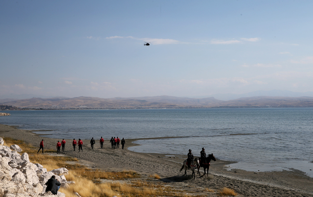 Van Gölü sahilinde Çevik Kuvvet polisleri, polis atlı birlikleri, göl üzerinde ise jandarma, polis, AFAD ve itfaiye ekipleri tekne ve botlarla arama çalışması yapıyor.
