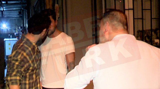 Ünlü oyuncu, Oğulcan Eren Akay ile birlikte mekandan ayrılırken flaşların patlamasıyla şaşkınlık yaşadı.