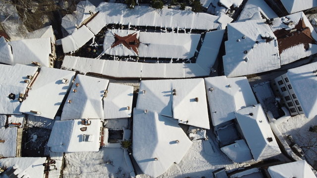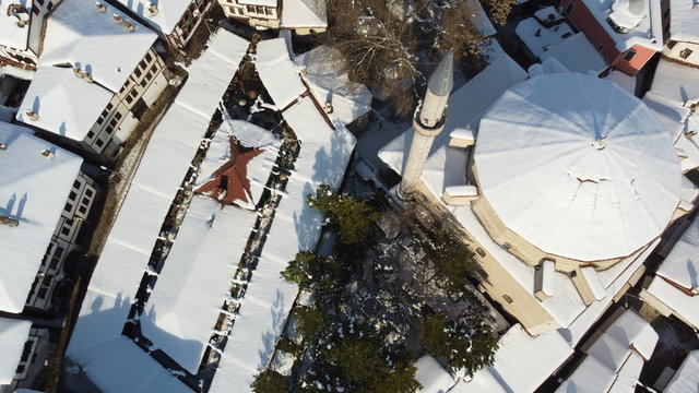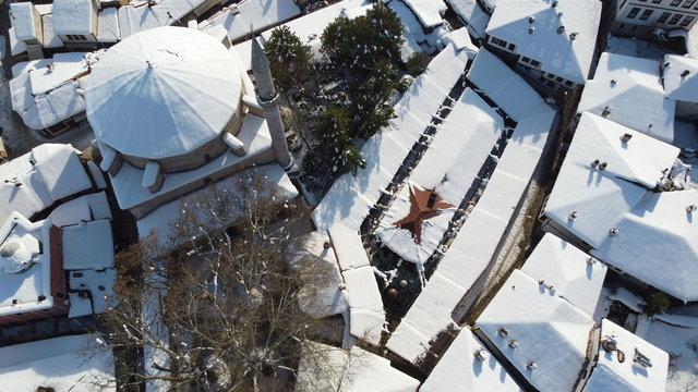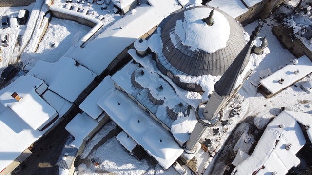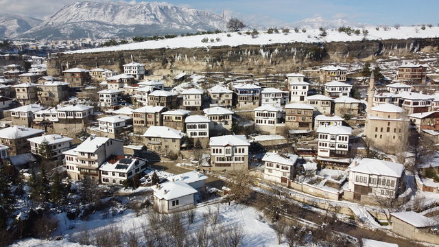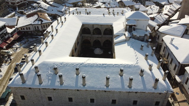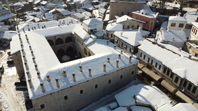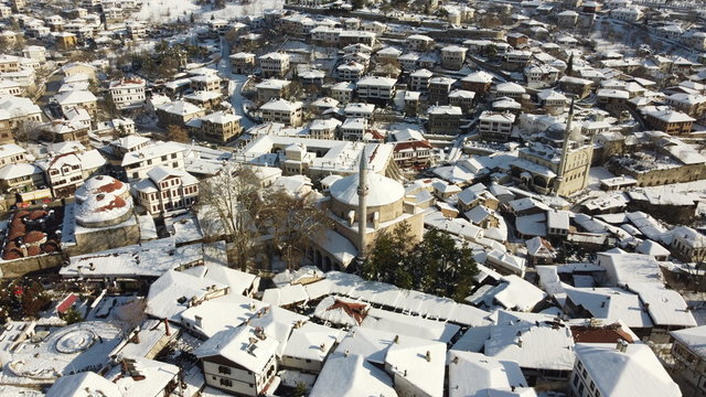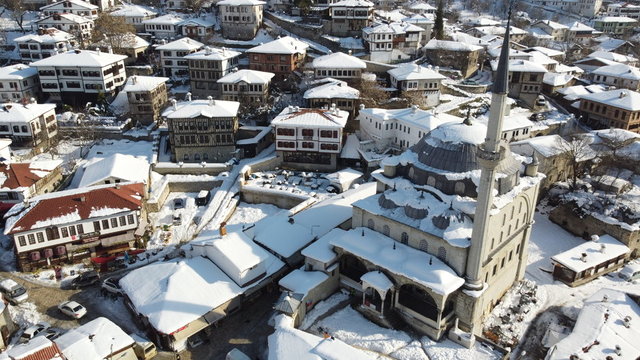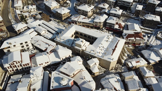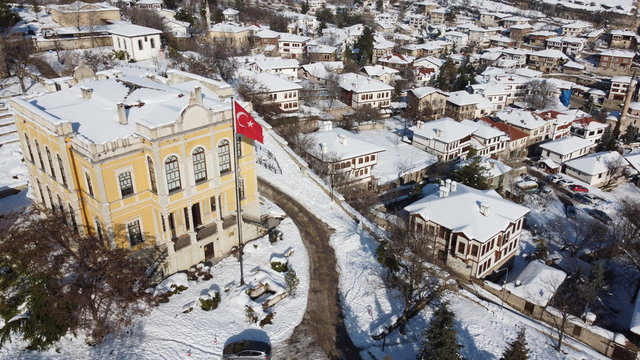 UNESCO Dünya Mirası Listesi'nde bulunan Karabük'ün Safranbolu ilçesinde beyaz örtüyle kaplanan tarihi mekanların havadan çekilen görüntüleri farklı görüş imkanı sunuyor.