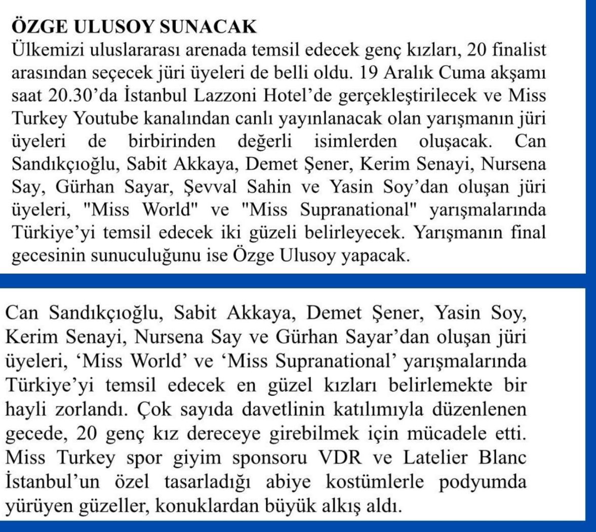 Şevval Şahin'in adı; Miss Turkey'in jüri bülteninde geçerken, final gecesi bülteninde geçmedi.