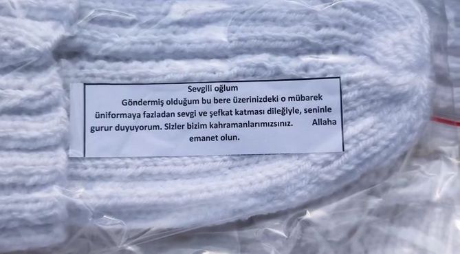 Yalova’da yaşayan 75 yaşındaki Sabahat teyzemizin örmüş olduğu 400 bere, Siirt İl Jandarma Komutanlığı emrinde görevli kahraman Jandarma Komandolarımıza ulaştırıldı.