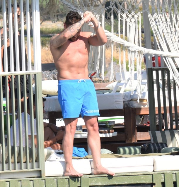 Bir süre yüzdükten sonra denizden çıkan Sinan Akçıl, kaslı ve fit vücuduyla dikkat çekti.