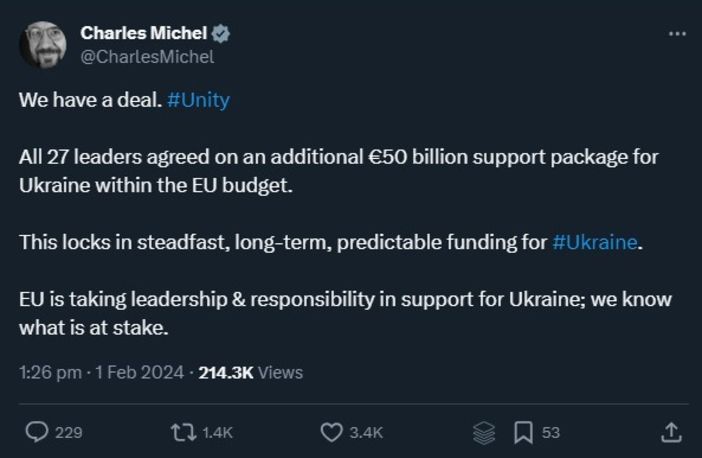 Michel, "27 liderin tümü, AB bütçesi kapsamında Ukrayna'ya ek 50 milyar euroluk destek paketi üzerinde anlaşmaya vardı" ifadesini kullandı.
