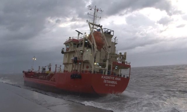 "Kadriye Ana" isimli Türkiye bandıralı tanker, lodos nedeniyle Zeytinburnu açıklarında kıyıya sürüklendi.