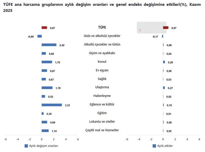 En yüksek ağırlığa sahip 3 ana harcama grubunun aylık değişimleri; gıda ve alkolsüz içeceklerde yüzde 0.69 azalış, ulaştırmada yüzde 1,78 artış ve konutta yüzde 1,70 artış olarak gerçekleşti. İlgili ana grupların aylık değişime olan etkileri ise gıda ve alkolsüz içeceklerde yüzde -0.17, ulaştırmada yüzde 0.27 ve konutta yüzde 0.29 oldu.