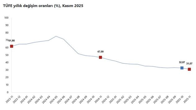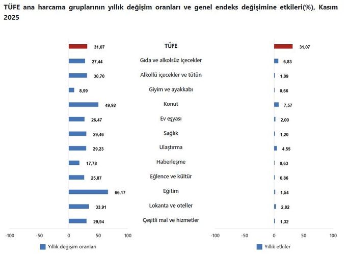 TÜİK kasım ayı Tüketici Fiyat Endeksi (TÜFE) gerçekleşmelerini açıkladı. Buna göre kasımda enflasyon yıllık yüzde 31.07, aylık yüzde 0.87 oldu. 12 aylık ortalama ise yüzde 35.91 olarak hesaplandı.