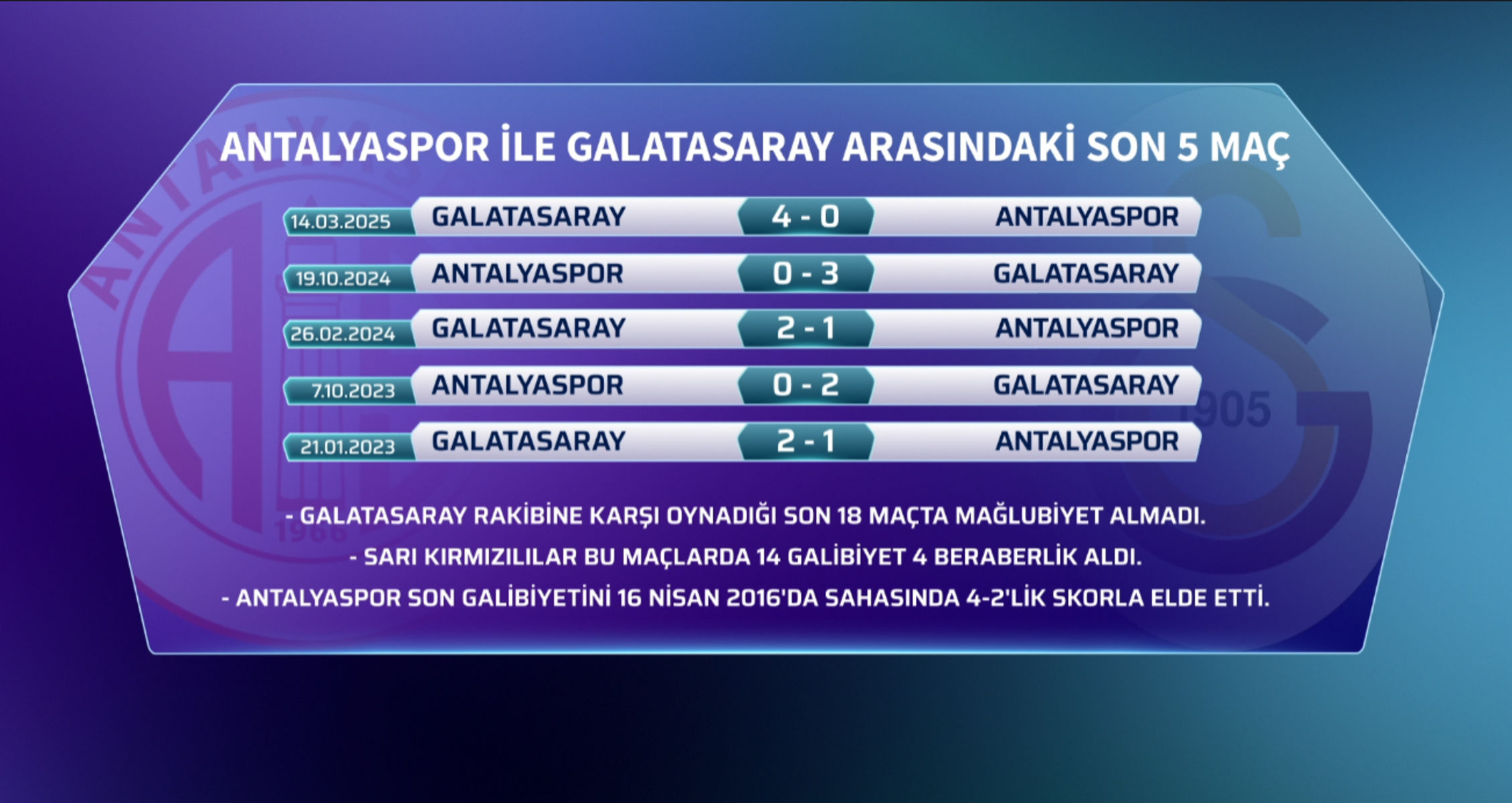 Lider Galatasaray, Trendyol Süper Lig'in 16. haftasında bu akşam Hesap.com Antalyaspor'a konuk olacak. Corendon Airlines Park Antalya Stadı'ndaki karşılaşma, saat 20.00'de başlayacak. Mücadeleyi hakem Ali Yılmaz yönetecek.