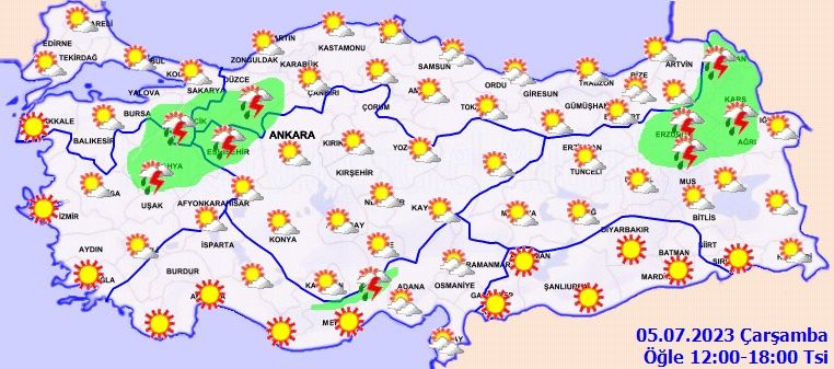 Meteoroloji Genel Müdürlüğü tarafından yapılan son değerlendirmelere göre: Ülkemizin kuzey ve iç kesimleri yer yer parçalı bulutlu, öğle saatlerinden sonra Doğu Akdeniz'in Toroslar mevki ile Erzurum, Kars, Ardahan, Bolu, Sakarya'nın güneyi, Bursa'nın doğusu, Eskişehir, Bilecik ve Kütahya çevreleri yerel sağanak ve gök gürültülü sağanak yağışlı, diğer yerlerin açık geçeceği tahmin ediliyor.