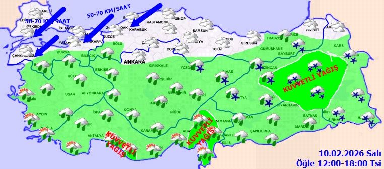 Meteoroloji Genel Müdürlüğü olarak yapılan değerlendirmelere göre: Ülkemiz genelinin çok bulutlu, Ege, Akdeniz, İç Anadolu, Orta ve Doğu Karadeniz, Doğu ve Güneydoğu Anadolu ile Balıkesir, Bursa, Bilecik, Sinop, Bolu çevreleri, Çanakkale'nin doğusu, Kırklareli, İstanbul ve Kocaeli'nin kuzey ilçelerinin aralıklı yağışlı geçecek. Yağışların genellikle yağmur ve sağanak, iç ve doğu kesimlerin yüksekleri karla karışık yağmurlu, Doğu Anadolu'nun doğusunun kar yağışlı geçeceği tahmin ediliyor. Yağışların, Antalya’nın doğusu, Hatay, Osmaniye, Erzurum, Ağrı, Bitlis, Tunceli, Bingöl, Muş, Hakkari, Şırnak, Batman, Siirt çevreleri, Adana'nın doğusu ve Kahramanmaraş'ın batısında yerel kuvvetli olması bekleniyor. Rüzgarın; Marmara ve Batı Karadeniz kıyılarında kuzey ve kuzeydoğu yönlerden kuvvetli olarak (50-70 km/saat) esmesi bekleniyor. Sabah ve gece saatlerinde doğu bölgelerde buzlanma ve don olayı bekleniyor. Doğu Karadeniz’in iç kesimlerinin yüksekleri ile Doğu Anadolu’nun doğusunda yüksek kar örtüsüne sahip eğimli kesimlerinde çığ ile kar erimesi tehlikesi bulunmaktadır.