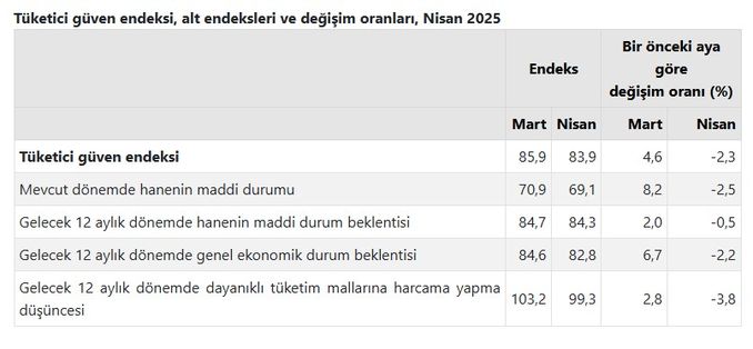 Türkiye İstatistik Kurumu ve Türkiye Cumhuriyet Merkez Bankası işbirliği ile yürütülen tüketici eğilim anketi sonuçlarından hesaplanan tüketici güven endeksi, Mart ayında 85,9 iken Nisan ayında yüzde 2,3 oranında azalarak 83,9 oldu.