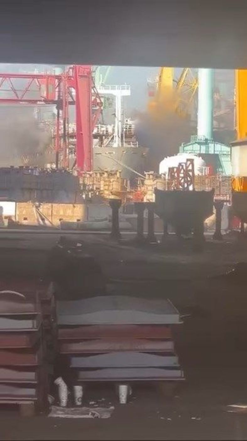 Tuzla'da tersanedeki gemide çıkan yangına itfaiye ekipleri müdahale ediyor.
