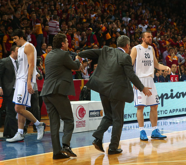 Karşılaşmanın 17. dakikasında Anadolu Efes Başantrenörü Oktay Mahmuti üst üste aldığı iki teknik faul sonucunda diskalifiye edildi. Lacivert-beyazlı takımın hücumunda oluşan karambolde top dışarı çıkarken hakem Semih Vural, Galatasaray Medical Park lehine karar verdi. Vural, karara sinirlenerek sahaya giren ve kendisine tepki gösteren Oktay Mahmuti'ye teknik faul çaldı. Lacivert-beyazlı antrenör, bu sefer de teknik masanın önündeki başhakem Rüştü Nuran'a gidip uzun süre itirazda bulundu. Nuran da ikinci teknik faul çaldığı Mahmuti'yi diskalifiye etti. Bu karar sonrasında Anadolu Efes Başantrenörü Oktay Mahmuti, soyunma odasına gitti.