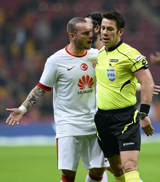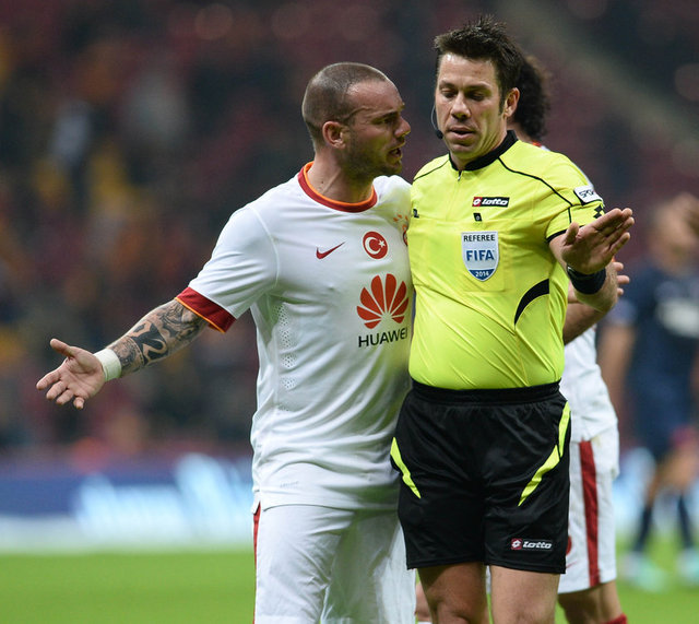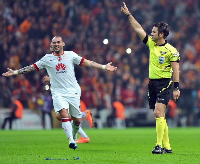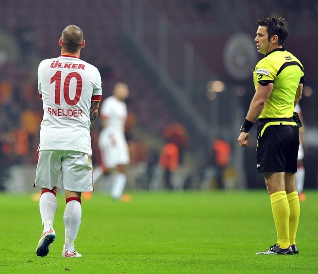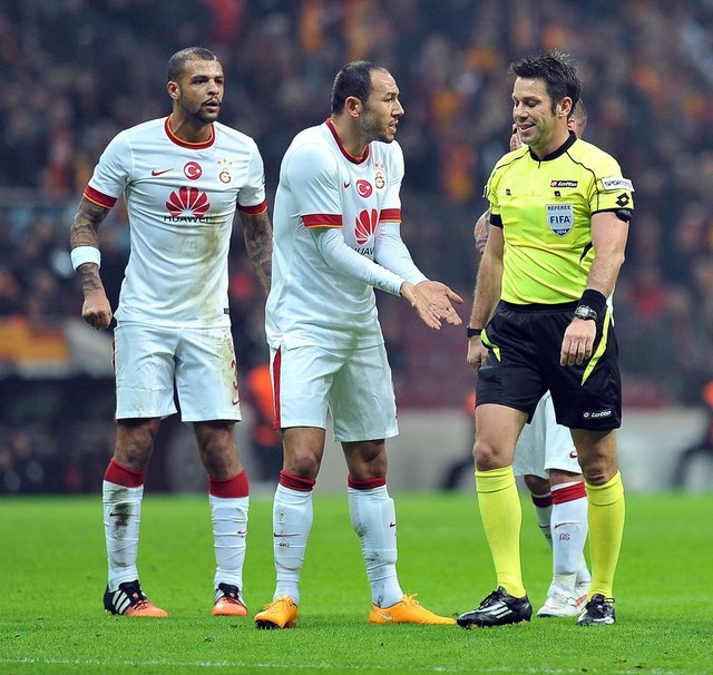 Galatasaraylı futbolcular ile teknik heyet, maçın 23, 30 ve 77. dakikalarında penaltı beklentisiyle hakem Fırat Aydınus'a itirazda bulundu. Sarı-kırmızılı takımın 23. dakikada geliştirdiği atakta Emre Çolak'ın şutunda, top ceza sahasında Servet Çetin'in koluna çarpıp geri dönerken, futbolcular Aydınus'a koşarak pozisyonun penaltı olduğunu öne sürüp itirazda bulundu. Ancak Aydınus'un devam kararı verdiği pozisyon sonrasında Mersin İdmanyurdu penaltı kazandı. Galatasaraylı futbolcu Sneijder, hakemin yanına giderek el işaretleriyle kendi pozisyonlarının da penaltı olduğunu savunarak itirazlarını sürdürdü. Bunun üzerine Fırat Aydınus, Hollandalı futbolcuya sarı kart gösterdi. Karşılaşmanın 30. dakikasında da Sneijder'in uzak mesafeden kullandığı serbest vuruşta, top ceza sahasında Serkan Balcı'nın koluna çarpınca Galatasaraylı futbolcular yine penaltı beklentisiyle itiraz etti, ancak hakem devam kararı verdi. Müsabakanın 77. dakikasında ise meşin yuvarlak, Burak Yılmaz ile hava topuna çıkan Mitrovic'in koluna çarpınca, sarı-kırmızılılar tekrar penaltı beklentisiyle itirazda bulundu. Bu pozisyonda Hamza Hamzaoğlu da saha kenarında maçın dördüncü hakemine itiraz etti.