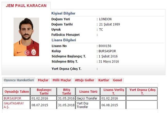 Süper Lig ekiplerinden Bursaspor, Galatasaray'ın orta saha oyuncusu Jem Paul Karacan'ı sezon sonuna kadar kiralık olarak kadrosuna kattı