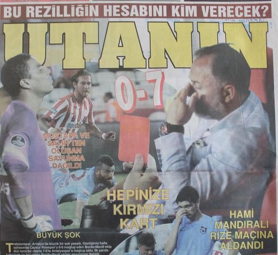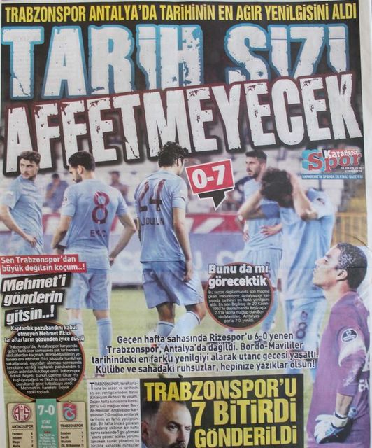 Trabzon'da yayımlanan yerel gazeteler, Trabzonspor'un Spor Toto Süper Lig'de dün deplasmanda Antalyaspor'a 7-0 mağlup olarak tarihinin en farklı yenilgi almasına tepki gösterdiler