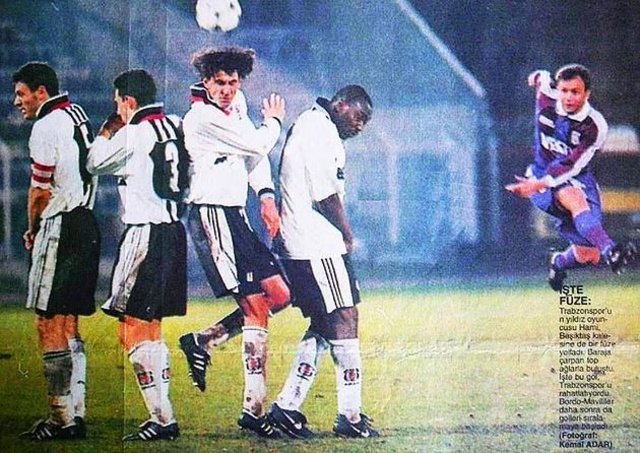 Avni Aker Stadı Şubat 1998 | Hami Mandıralı'nın frikik golü. Barajda Alpay, Tayfur, Emre ve Amokachi var. (TS-BJK)