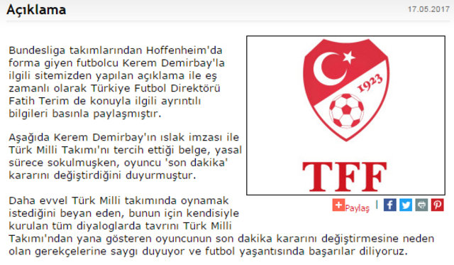 "Bundesliga takımlarından Hoffenheim'da forma giyen futbolcu Kerem Demirbay'la ilgili sitemizden yapılan açıklama ile eş zamanlı olarak Türkiye Futbol Direktörü Fatih Terim de konuyla ilgili ayrıntılı bilgileri basınla paylaşmıştır.