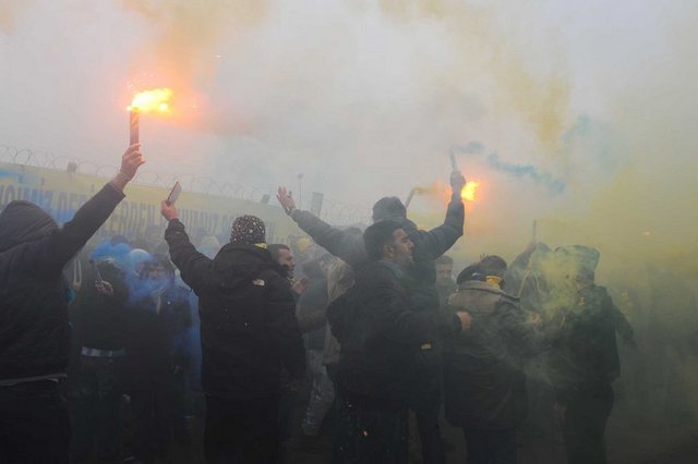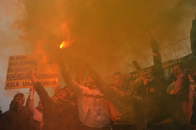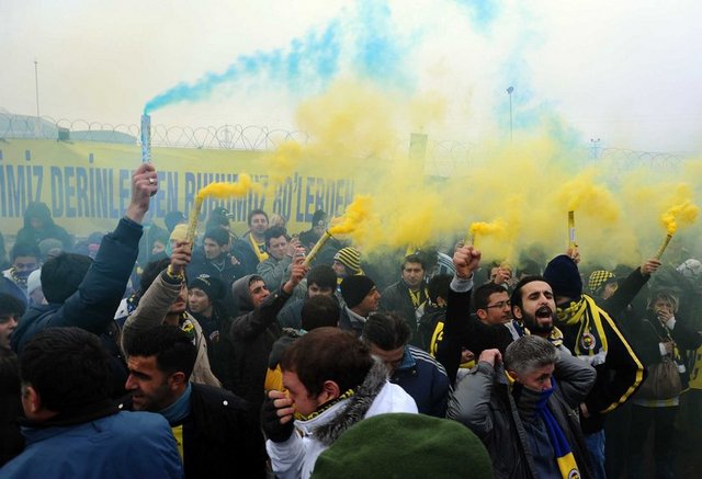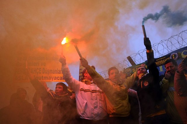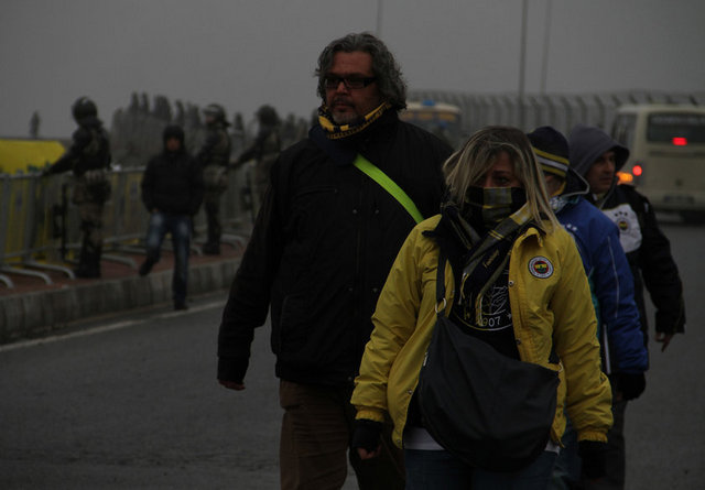 Eski Salı Pazarı'ndan çıkmadan önce tezahüratlar yapan ve meşale yakan taraftarlar, Mahmutbey gişelerini geçmeden önce de araçlarından çıkarak meşaleler yaktılar.