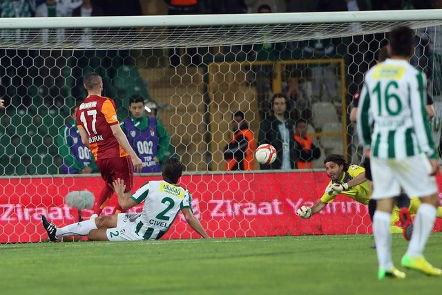 77. dakikada Bursasporlu Ozan Tufan'ın Galatasaray ceza sahası sağ çaprazından sert vuruşunda kaleci Muslera topu kayarak uzaklaştırdı.