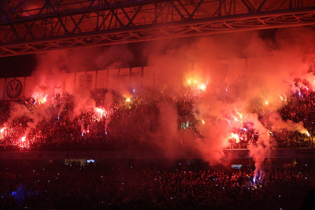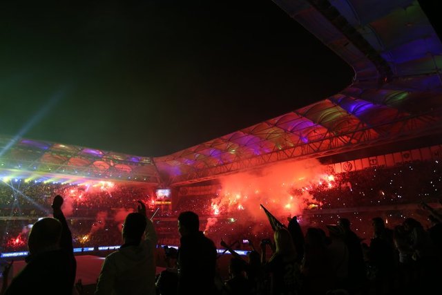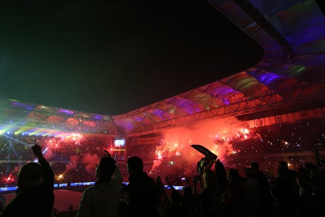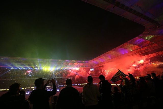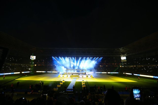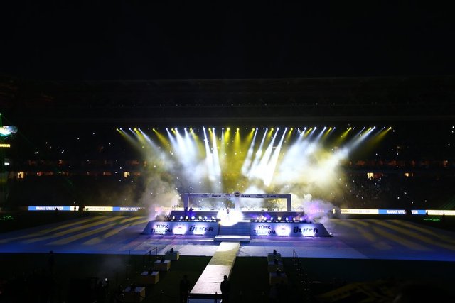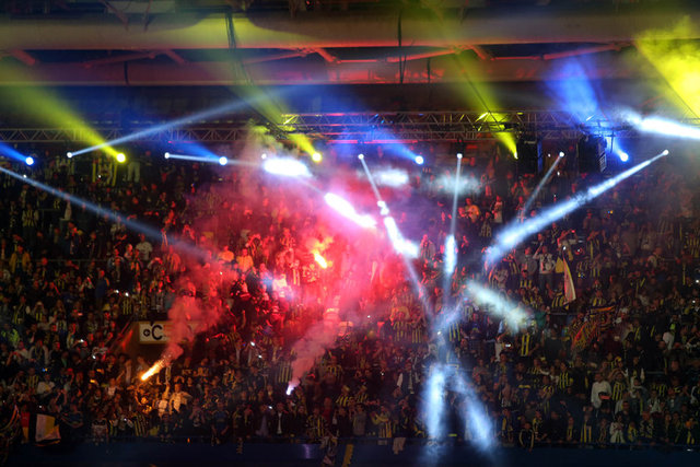 Havanın kararmasının ardından kutlamalar için hazırlanan ışık gösterileri başladı. Sarı-lacivertli renklerden oluşan ve stat hoparlörlerinde çalınan müziğe göre hareket eden ışık şovu geceye renk kattı. Bu arada, futbol takımının şampiyonluk kupa töreni için sahanın ortasında sahne kuruldu.