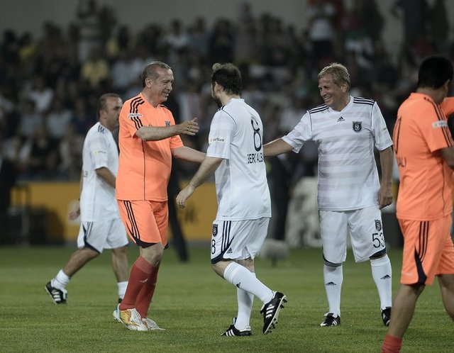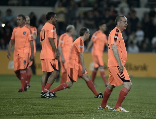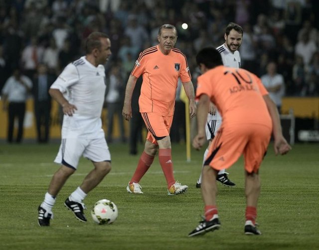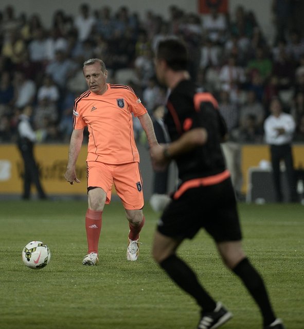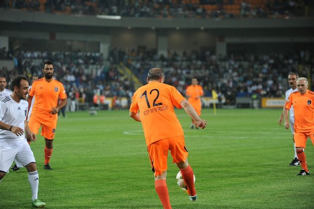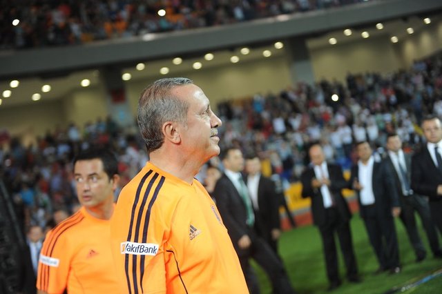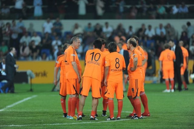 Mücadelenin ilk yarısını turuncu takım, penaltıdan bulduğu golle 4-3 önde tamamladı. Başbakan Erdoğan, tek devre sahada kaldıktan sonra soyunma odasına gitti. Erdoğan, bu sırada kale arkasında bulunan seyircilerle tokalaştı. Tribündeki bir gencin uzun süre sarıldığı Erdoğan, engelli bir gençle de yakından ilgilendi. Mücadeleyi turuncu takım, 9-4 kazandı.