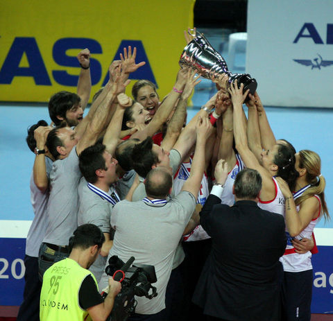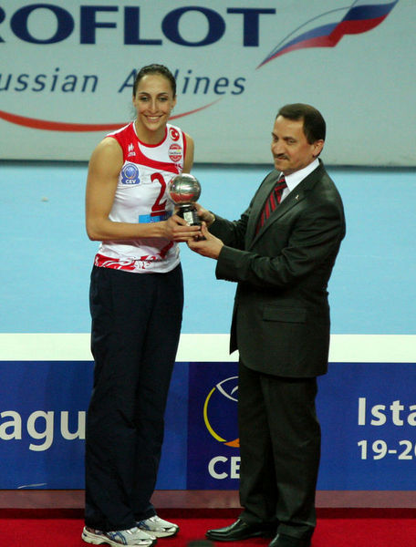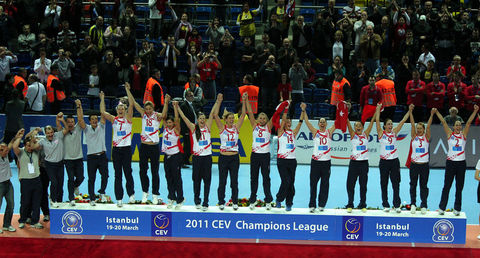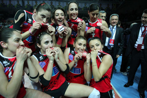 Avrupa Şampiyonlar Ligi'nde şampiyonluğa ulaşan ilk Türk takımı olan Vakıfbank Güneş Sigorta Türk Telekom oyuncuları şampiyonluk kupasını CEV Başkanı Andre Meyer'in elinden aldı.