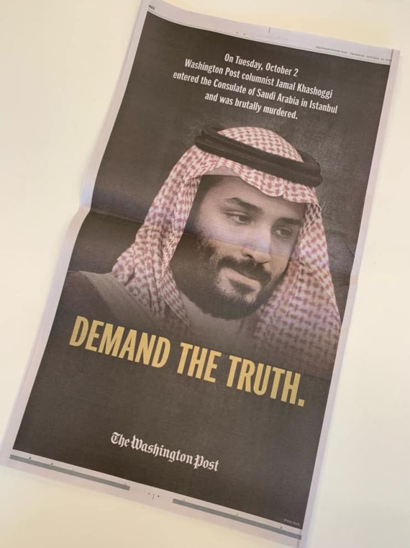Amerikan Washington Post gazetesi, öldürülen köşe yazarı Cemal Kaşıkçı için tam sayfa ilan yayınladı. Gazetenin arka kapağında yer alan ilanda Suudi Veliaht Prens Muhammed bin Selman'ın resmi kullanılırken, büyük puntolarla 'Gerçeği talep edin' ifadelerine yer verildi