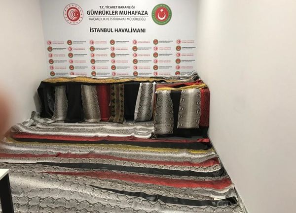 Ticaret Bakanlığı Gümrük Muhafaza ekiplerince İstanbul Havalimanı'nda gerçekleştirilen operasyonda bir yolcunun bagajında toplam uzunluğu 355 metre olan 93 adet işlenmiş yılan derisi yakalandı.