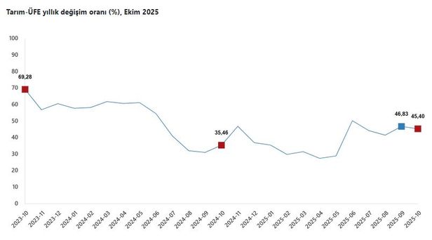 Tarım ürünleri üretici fiyat endeksi (Tarım-ÜFE) ekimde aylık bazda yüzde 4 yükselirken, yıllık yüzde 45,40 arttı